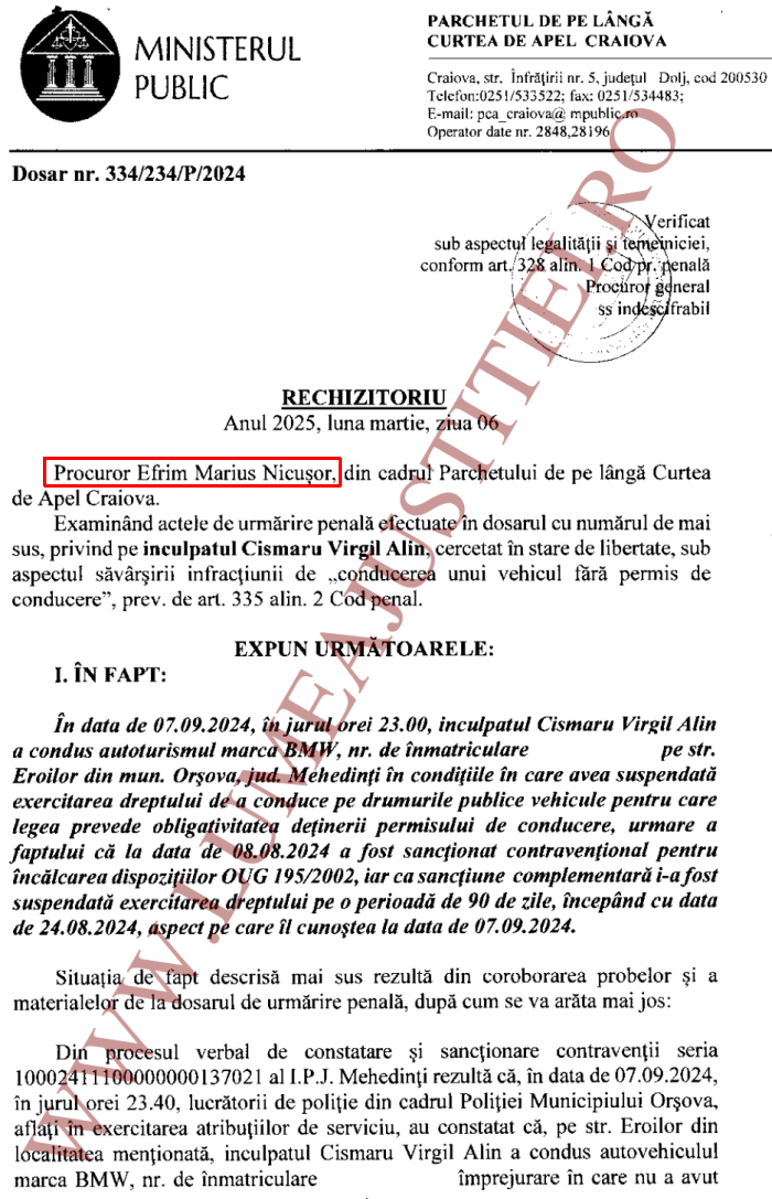Precizăm că rechizitoriul nr. 334/234/P/2024 din 6 martie 2025 a fost întocmit de către procurorul Marius-Nicușor Efrim (foto 3) de la Parchetul de pe lângă Curtea de Apel Craiova, actul de acuzare fiind confirmat de către șeful PCA Craiova Eugen-Cristian Grigorie (vezi facsimil).