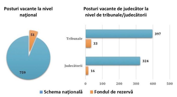 Din totalul schemei naţionale de 5071 de posturi de judecător aprobate în România, sunt vacante la acest moment 759 de posturi, respectiv 15%. La acestea se adaugă 51 de posturi vacante din totalul celor 283 de posturi aprobate din fondul de rezervă. În total, cumulat, numărul posturilor vacante este de 810 posturi de judecător.