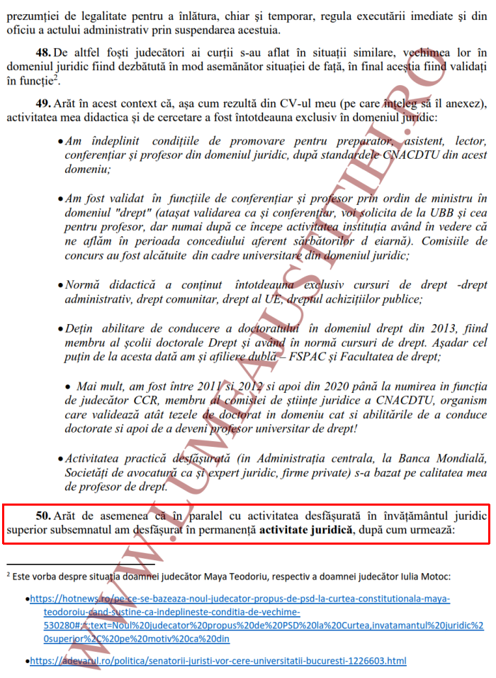 • Peste 23 de ani la Facultatea de Științe Politice și Administrative a Universității Babeș-Bolyai - activitate care, deși valoroasă academic, nu constituie învățământ juridic superior în sensul art. 143 din Constituție
