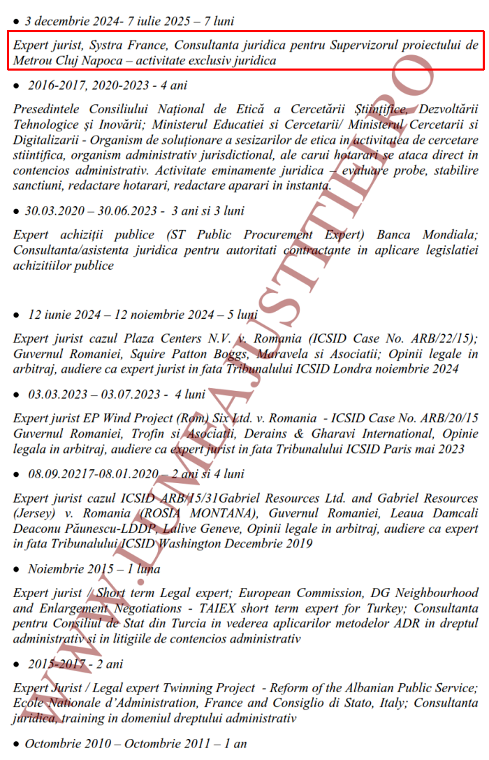 Pct. I, IV, V, VI, VII, VIII: expert juridic în diverse proiecte, fie în proiecte desfășurate de Banca Mondială, fie în arbitraje internaționale desfășurate la ICSID, fie pentru un profesionist (Systra S.A. Sucursala București)