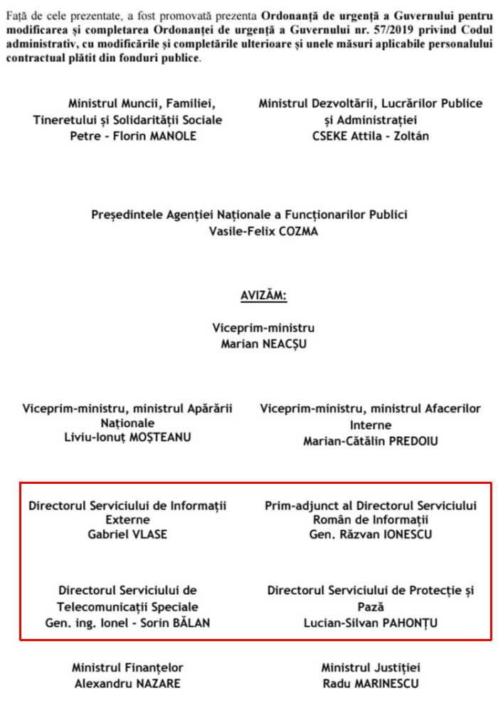 In fine – de ce am adus vorba despre asta: nu e nimic ilegal ca sefii serviciilor de informatii sa semneze un proiect de OUG care ii vizeaza (vezi facsimil). Este insa ironic ca acestia sunt de acord ca regimul PSD-PNL-USR-UDMR sa le taie veniturile. Adica (vezi, Doamne!) au constientizat cat de greu o duce bugetul, asa ca fac si ei un sacrificiu. Ce sa zicem... Ne-am umplut de solemnitate.
