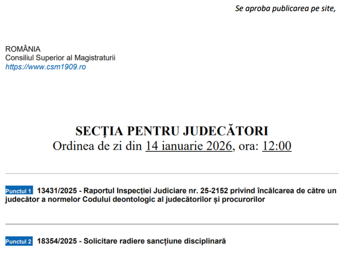 * Prima ședință a Secției pentru judecători din CSM în mandatul de președinte al judecătorului Liviu Odagiu (foto) – programată pentru ziua de marți, 13 ianuarie 2026 – are pe ordinea de zi doar două puncte: o cerere privind radierea unei sancțiuni disciplinare și un dosar deontologic (vezi facsimil).
