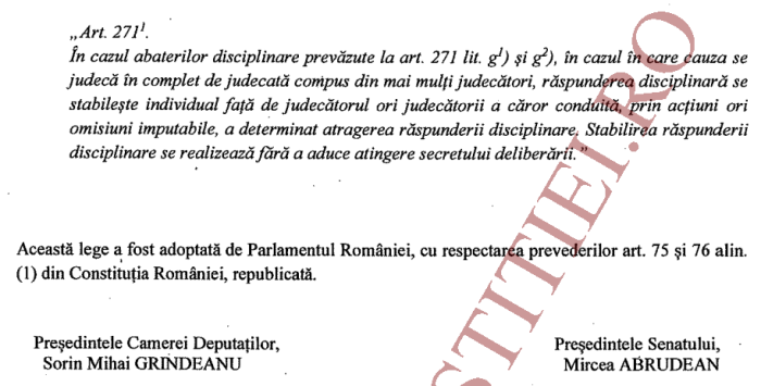 În fine, în ceea ce privește propunerea de introducere a art. 271^1, Plenul constată că aceasta pierde din vedere faptul că raportul dintre caracterul colegial al activității judiciare şi principiul personalității răspunderii disciplinare este analizat şi în prezent, chiar în absenţa unui asemenea text. Din această perspectivă, soluția propusă apare ca fiind redundantă.