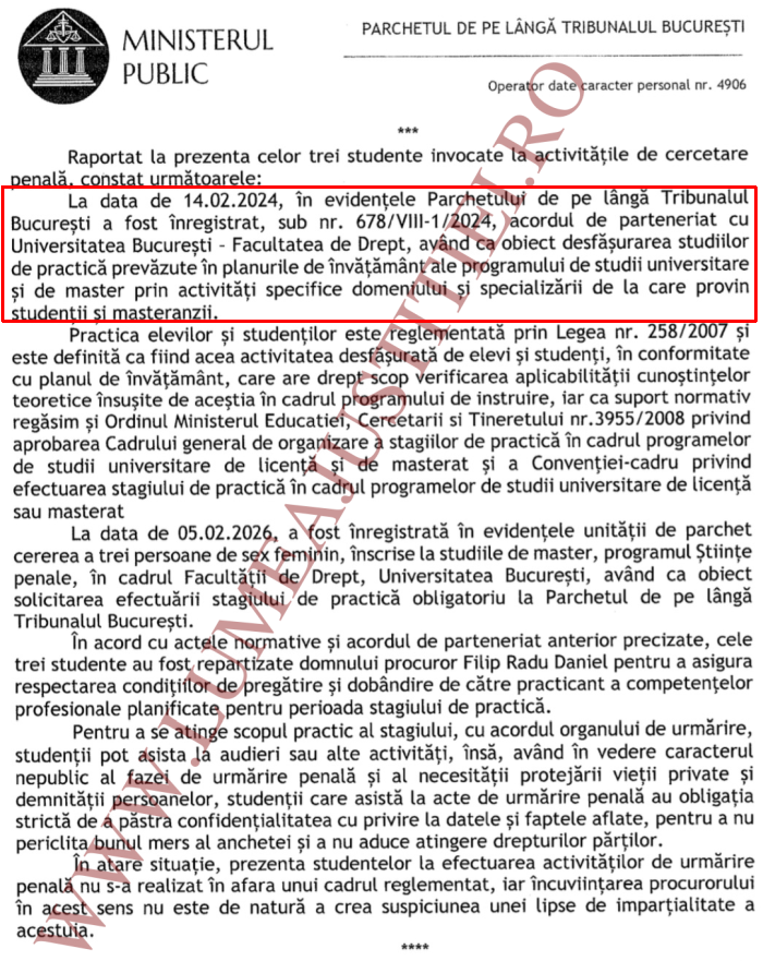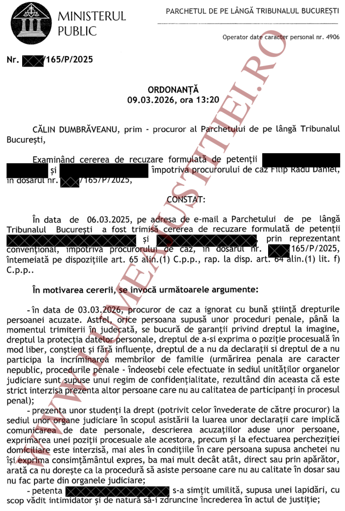 Însă scandalul nu se opreşte aici: vineri, 6 martie 2026, avocatul a formulat cerere de recuzare a procurorului Radu Filip, însă șeful PTB Călin Dumbrăveanu a respins demersul. Mai mult: în aceeaşi ordonanţă de refuz al recuzării (emisă luni, 9 martie), prim-procurorul Dumbrăveanu dezvăluie cum a fost posibilă prezența respectivei studente la un act nepublic al urmăririi penale. Concret, procurorul Călin Dumbrăveanu a invocat acordul de parteneriat încheiat la 14 februarie 2024 între Parchetul Capitalei și Facultatea de Drept de la Universitatea din Bucureşti. În baza acestui acord, la 5 februarie 2026, au fost selectate nu mai puțin de trei masterande pentru a-și face practica universitară la PTB, mai spune Călin Dumbrăveanu.