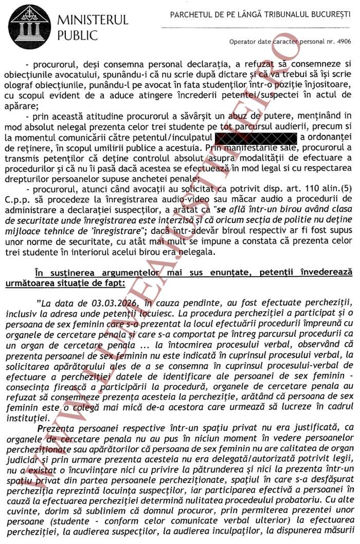 Astfel, în data de 03.03.2026, la locuința suspecților B.S. și B.V. situată în București s-a desfășurat o percheziție domiciliară la care a participat în mod activ o studentă repartizată în practică la procurorul Filip Radu Daniel, procuror care supraveghea activitatea organelor de cercetare penală. Studenta în cauza nu numai că nu și-a declinat identitatea și calitatea, dar a și efectuat acte de percheziționare a locuinței, căutând documente, răscolind dulapuri, chestionând suspecții cu privire la conținutul anumitor înscrisuri, solicitarea avocaților de a fi menționată în procesul-verbal de percheziție domiciliară fiind refuzată de inspector principal de poliție Gurlup Gabriel și inspector de poliție Solomon Dănuț din cadrul S.I.C.E. Sector 6, sub pretextul că nu este necesară consemnarea prezenței acesteia, întrucât este ‘o colegă mai mică’.