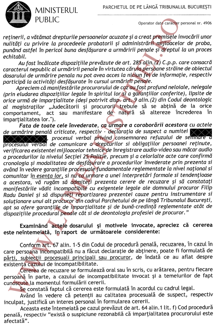Față de toate cele învederate, ca urmare a coroborării acestora cu actele de urmărire penală criticate, respectiv declaraţia de suspect a numitei (...), procesul-verbal privind consemnarea refuzului de semnare a procesului-verbal de comunicare a drepturilor si obligaţiilor persoanei reţinute, verificarea existenței mijloacelor tehnice de înregistrare audio-video sau măcar audio a procedurilor la nivelul Secţiei 25 Poliție, precum și a celorlalte acte care confirmă cronologia și modalitatea de desfăşurare a procedurilor învederate prin prezenta și având în vedere garanțiile procesuale fundamentale reglementate la nivel naţional și comunitar în esența lor (și nu ca urmare a unei interpretări formale și tendenţioase a acestora), vă rugăm să admiteți prezenta cerere de recuzare și să constataţi manifestările vădit incompatibile cu exigențele legale ale domnului procuror Filip Radu Daniel și să dispuneți repartizarea prezentei cauze pentru instrumentare și soluţionare unui alt procuror din cadrul Parchetului de pe lângă Tribunalul Bucureşti, apt sa ofere garanţiile de imparţialitate și de bună-credinţă reglementate atât de dispoziţiile procedural-penale, cât si de deontologia profesiei de procuror’.