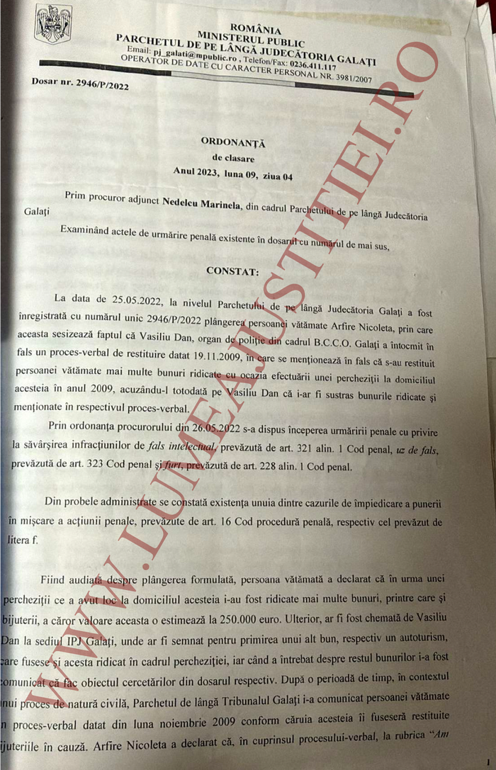 Drept urmare, procuroarea Marinela Nedelcu a confirmat falsificarea procesului-verbal de restituire a bijuteriilor, dar – prin Ordonanța de clasare din 4 septembrie 2023, dispusă în dosarul 2946/P/29022 (vezi facsimil 2) –, a constatat intervenită prescripția: