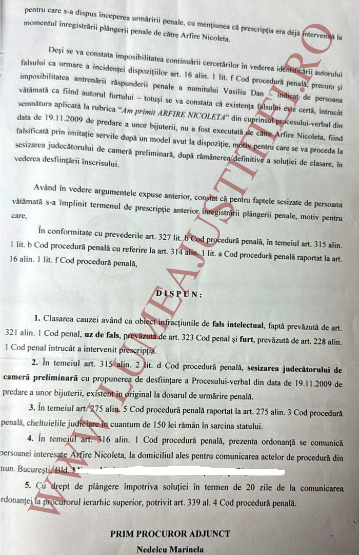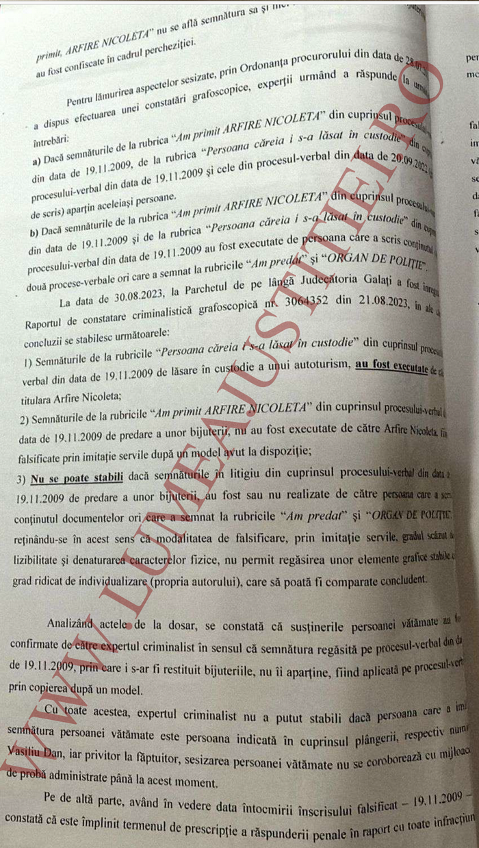 „Se va constata că existența falsului este certă, întrucât semnătura aplicată la rubrica 'Am primit Arfire Nicoleta' din cuprinsul procesului-verbal din data de 19.11.2009 de predare a unor bijuterii, nu a fost executată de către Arfire Nicoleta, fiind falsificată prin imitație servilă după un model avut la dispoziție, motiv pentru care se va proceda la sesizarea judecătorului de cameră preliminară, după rămânerea definitivă a soluției de clasare, în vederea desființării înscrisului”.