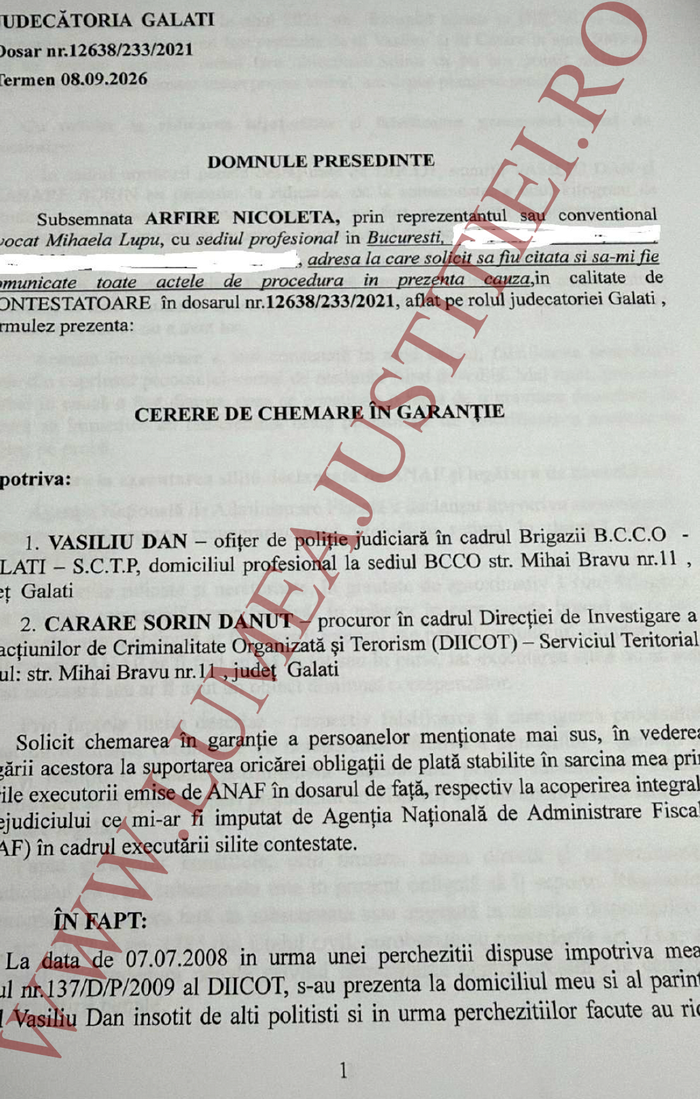 Reușind așadar să probeze falsificarea procesului-verbal de restituire a bijuteriilor, Nicoleta Arhire – reprezentată de avocata Mihale Lupu (foto 1) din Baroul București – a formulat cerere de chemare în garanție împotriva procurorului Sorin Cărare (foto 2, șef DIICOT Galați la data ridicării bijuteriilor și falsificării procesului-verbal) și împotriva polițistului Dan Vasiliu (vezi facsimil 3). Cererea de chemare în garanție a fost depusă în dosarul în care Nicoleta Arfire a făcut contestație la executare față de măsurile dispuse de ANAF, cauză aflată pe rolul Judecătoriei Galați.