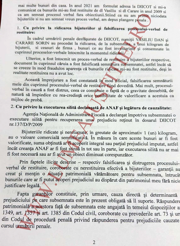 În acest context, Nicoleta Arfire solicită Judecătoriei Galați să-i oblige pe fostul șef DIICOT Galați Sorin Cărare și pe polițistul Dan Vasiliu, în solidar sau separat, să achite sumele la care aceasta ar fi obliogată să le plătească în favoarea ANAF, în măsura în care valoarea bijuteriilor nereturnate acoperă ori reduce creanța.