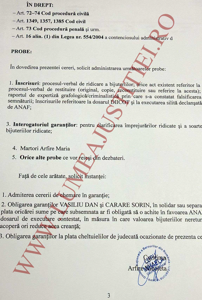 Concret, avocata Mihaela Lupu explică în cererea de chemare în garanție că bijuteriile ridicate de DIICOT ar fi putut acoperi integral sau parțial prejudiciul imputat clientei sale, pentru care este executată silit de ANAF:
