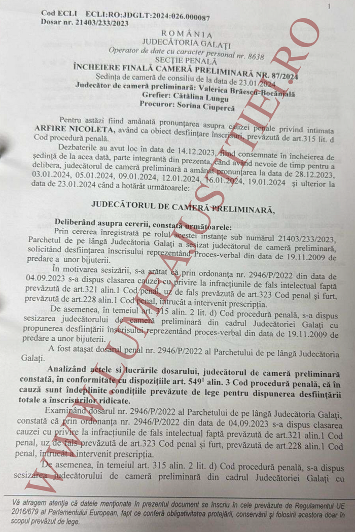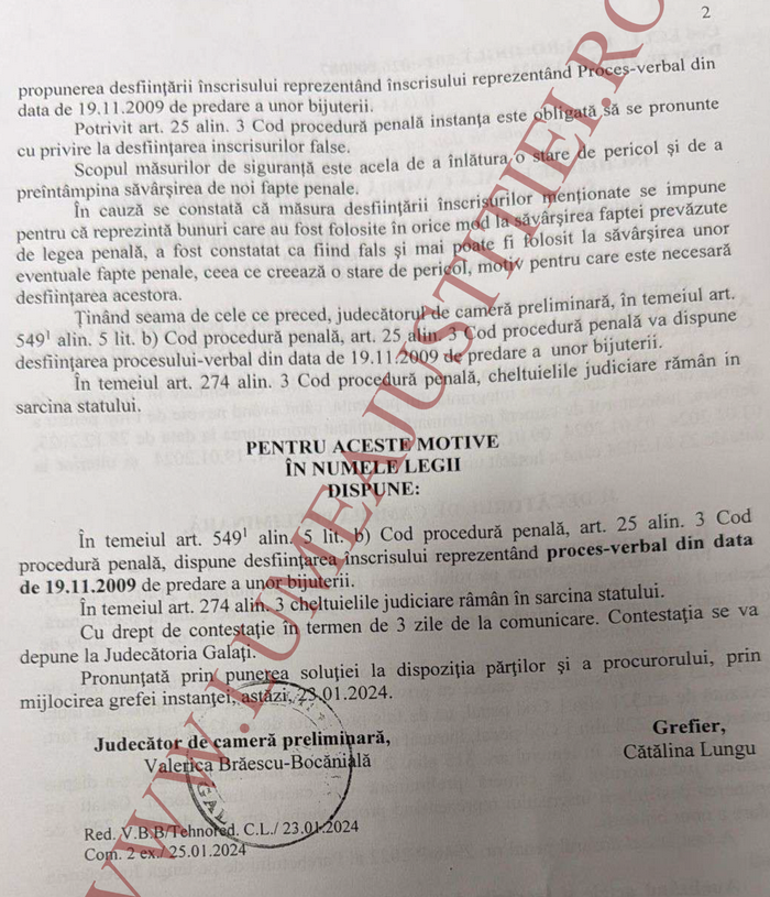 Câteva luni mai tărziu, prin Încheierea de cameră preliminară nr. 87 din 23 ianuarie 2024, pronunțată în dosarul 21403/233/2023 (vezi facsimil 2), judecătoarea Valerica Brăescu-Bocănială de la Judecătoria Galați a desființat procesul-verbal de restituire a bijuteriilor, stabilit deja ca fiind unul fals: