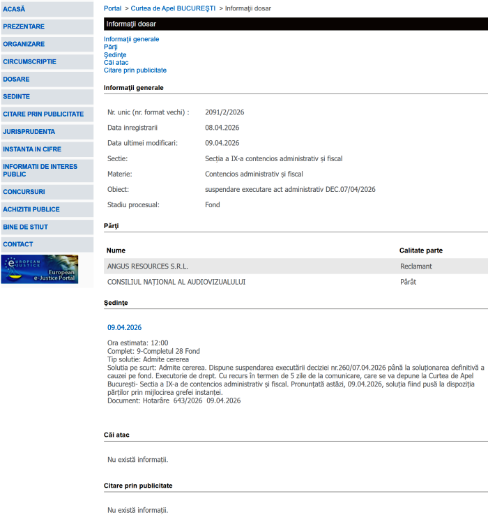 Cu recurs în termen de 5 zile de la comunicare, care se va depune la Curtea de Apel Bucureşti – Sectia a IX-a de contencios administrativ şi fiscal. Pronunţată astăzi, 09.04.2026, soluţia fiind pusă la dispoziţia părţilor prin mijlocirea grefei instanţei”.