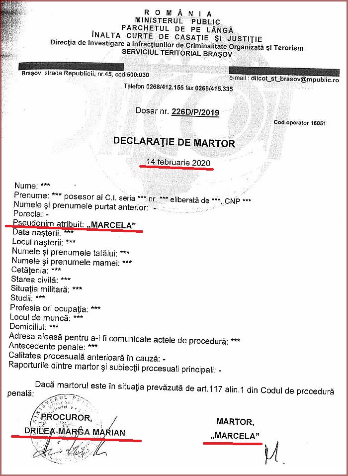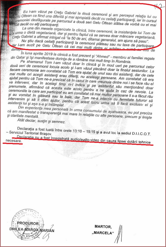 Foarte ciudat – si convenabil in acelasi timp – la finalul declaratiei date de martorul cu identitate protejata "Marcela", procurorul Marian Drilea Marga a precizat in scris: "Declaratia nu a fost inregistrata audio/ audio-video din cauza lipsei dotarii tehnice necesare" - (vezi facsimil 1)