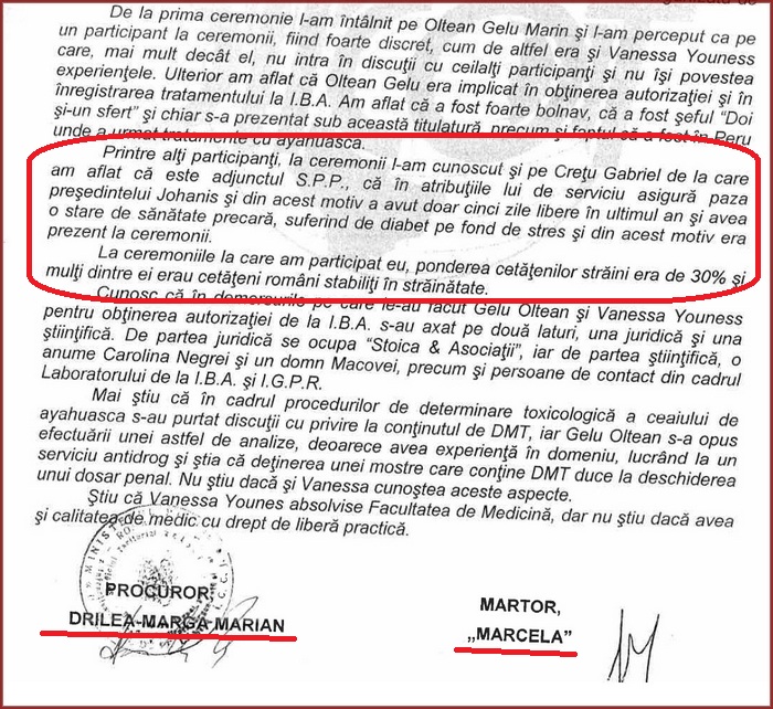 GENERALUL SPP GABRIEL CRETU, MAZILIT CU DOSARUL AYAHUASCA – Marturie uluitoare a avocatului Bogdan Mircea Dumitru la Tribunalul Dambovita: procurorul DIICOT Marian Drilea Marga a insistat sa-i atribuie calitatea de martor protejat fara sa o fi cerut, pentru a ajunge la seful pazei lui Klaus Iohannis. Rechizitoriul lui Drilea contine acuzatii securistice la adresa fostului sef al DIPI Gelu Oltean, neinsotite de nicio dovada privind "obtinerea de informatii" (Documente)