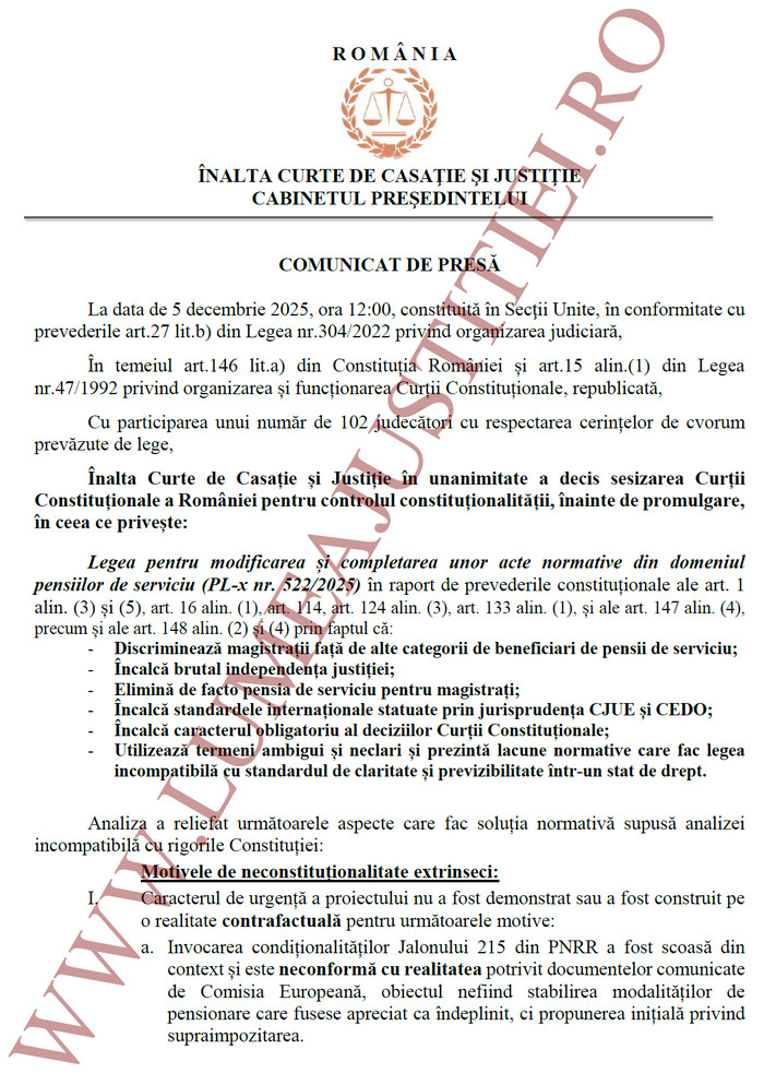 Lumea Justitiei prezinta motivele pentru care Inalta Curte de Casatie si Justitie a decis atacarea la Curtea Constitutionala a Romaniei a legii privind modificarile la pensiile de serviciu ale magistratilor. Este vorba despre sesizarea pentru controlul constitutionalitatii, inainte de promulgare, in ceea ce priveste ”Legea pentru modificarea si completarea unor acte normative din domeniul pensiilor de serviciu (PL-x nr. 522/2025)”, sesizare votata in unanimitate vineri, 5 decembrie 2025, de cei 102 de judecatori ICCJ care au participat la sedinta Sectiilor Unite ale instantei supreme.