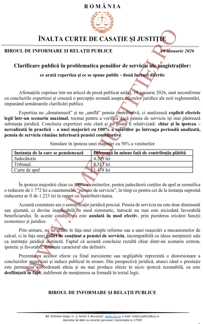ÎNALTA CURTE DEMONTEAZĂ MANIPULAREA PE PENSII – ICCJ reacționează după ce a fost acuzată că a calculat greșit simularea ce arată că pensiile de serviciu ale magistraților vor fi desființate de noua lege: „Expertiza analizează efectele legii într-un scenariu maximal, pentru a verifica dacă pensia de serviciu își păstrează substanța juridică. Concluzia: chiar și în ipoteza a unei majorări cu 100% a salariilor pe întreaga perioadă analizată, pensia de serviciu ramâne inferioară celei contributive”
