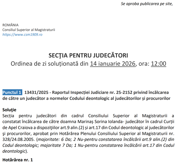 Secția pentru judecători din cadrul Consiliului Superior al Magistraturii a constatat încălcarea de către doamna Marinaș Sorina Iolanda – judecător în cadrul Curții de Apel Craiova – a dispoziţiilor art.9 alin.(2) și art.17 din Codul deontologic al judecătorilor şi procurorilor, aprobat prin Hotărârea Plenului Consiliului Superior al Magistraturii nr. 328/24.08.2005. (majoritate: 6 Da; 2 Nu – pentru constatarea încălcării art.9 alin.(2) din Codul deontologic; majoritate 7 Da; 1 Nu – pentru constatarea încălcării art.17 din Codul deontologic)”.