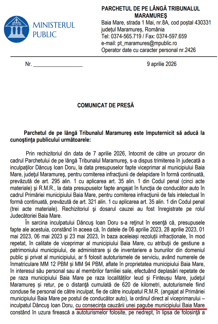 Prin rechizitoriul din data de 7 aprilie 2026, întocmit de către un procuror din cadrul Parchetului de pe lângă Tribunalul Maramureş, s-a dispus trimiterea în judecată a inculpaţilor Dăncuş Ioan Doru, la data presupuselor fapte viceprimar al municipiului Baia Mare, judeţul Maramureş, pentru comiterea infracţiunii de delapidare în formă continuată, prevăzută de art. 295 alin. 1 cu aplicarea art. 35 alin. 1 din Codul penal (cinci acte materiale) şi R.M.R., la data presupuselor fapte angajat în funcţia de conducător auto în cadrul Primăriei municipiului Baia Mare, pentru comiterea infracţiunii de fals intelectual în formă continuată, prevăzută de art. 321 alin. 1 cu aplicarea art. 35 alin. 1 din Codul penal (trei acte materiale). Rechizitoriul şi dosarul cauzei au fost înregistrate pe rolul Judecătoriei Baia Mare.