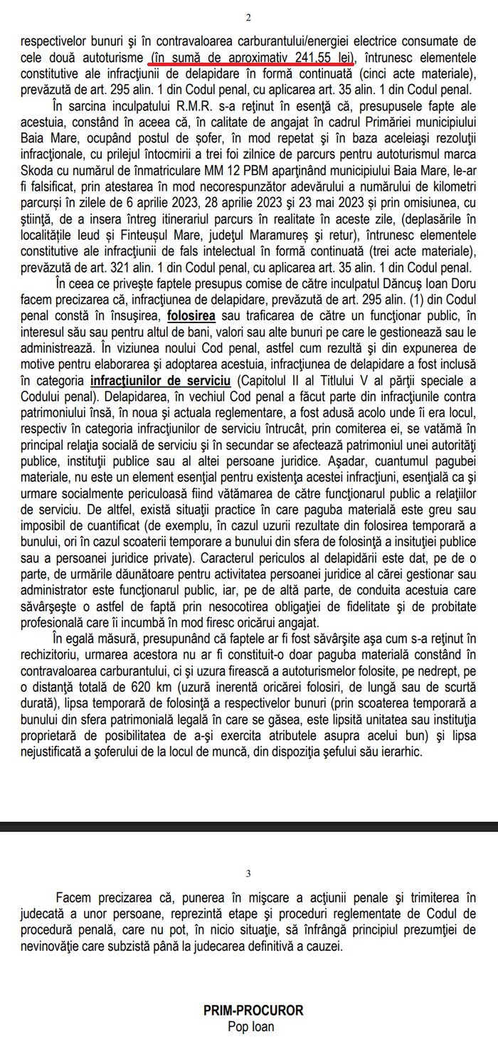 În sarcina inculpatului Dăncuş Ioan Doru s-a reţinut în esenţă că, presupusele fapte ale acestuia, constând în aceea că, în datele de 06 aprilie 2023, 28 aprilie 2023, 01 mai 2023, 06 mai 2023 şi 23 mai 2023, în baza aceleiași rezoluții infracționale, în mod repetat, în calitate de viceprimar al municipiului Baia Mare, cu atribuţii de gestiune a patrimoniului municipiului, de administrare şi de inventariere a bunurilor din domeniul public şi privat al municipiului, ar fi folosit autoturismele de serviciu, având numerele de înmatriculare MM 12 PBM și MM 94 PBM, aflate în proprietatea municipiului Baia Mare, în interesul său personal sau al membrilor familiei sale, efectuând deplasări repetate de pe raza municipiului Baia Mare pe raza localităților Ieud și Finteușu Mare, judeţul Maramureș și retur, pe o distanţă cumulată de 620 de kilometri, autoturismele fiind conduse fie personal de către inculpat, fie de către inculpatul R.M.R. (angajat al Primăriei municipiului Baia Mare pe postul de conducător auto), la ordinul direct al viceprimarului – inculpatul Dăncuş Ioan Doru, cu consecința cauzării unei pagube municipiului Baia Mare constând în uzura firească a autoturismelor folosite, pe nedrept, în lipsa de folosinţă a respectivelor bunuri şi în contravaloarea carburantului/energiei electrice consumate de cele două autoturisme (în sumă de aproximativ 241,55 lei), întrunesc elementele constitutive ale infracţiunii de delapidare în formă continuată (cinci acte materiale), prevăzută de art. 295 alin. 1 din Codul penal, cu aplicarea art. 35 alin. 1 din Codul penal.