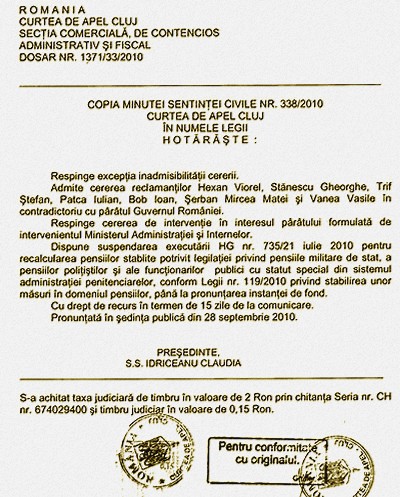 Magistratii Curtii de Apel Cluj au decis, in 28 septembrie 2010, suspendarea executarii Hotararii de Guvern numarul 735, emisa la 21 iulie 2010, care prevedea recalcularea pensiilor militare de stat, a pensiilor politistilor si ale functionarilor publici cu statut special din sistemul penitenciar. Decizia instantei nu este definitiva, putand fi atacata cu recurs in termen de 15 zile, dar este executorie. Instanta a fost sesizata in luna august de mai multi militari in rezerva din Cluj, membrii ai “Sindicatului Cadrelor Militare Disponibilizate, in Rezerva si in Retragere”, care au dat in judecata Guvernul Romaniei, nemultumiti de modalitatea in care urma sa li se recalculeze pensiile. Ca atare, magistratii acestei instante au decis suspendarea aplicarii Hotararii de Guvern pana la o decizie de fond in acest dosar.