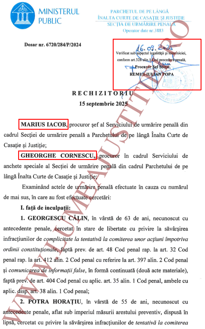 MOTIVAREA PE RECHIZITORIUL LUI GEORGESCU – Judecătorul CAB Mihai Cozma explică de ce PICCJ, nu DIICOT, e competent să instrumenteze dosarul lui Călin Georgescu și de ce e legal faptul că rechizitoriul a fost verificat de procurorul care s-a autosesizat: „Necompetenţa materială a fost invocată de inculpaţi şi în faţa ICCJ, în faza de UP, excepţia fiind respinsă ca nefondată... Procurorul-şef secţie nu a întocmit acte de urmărire penală. PV de sesizare din oficiu are natura unui act de sesizare”