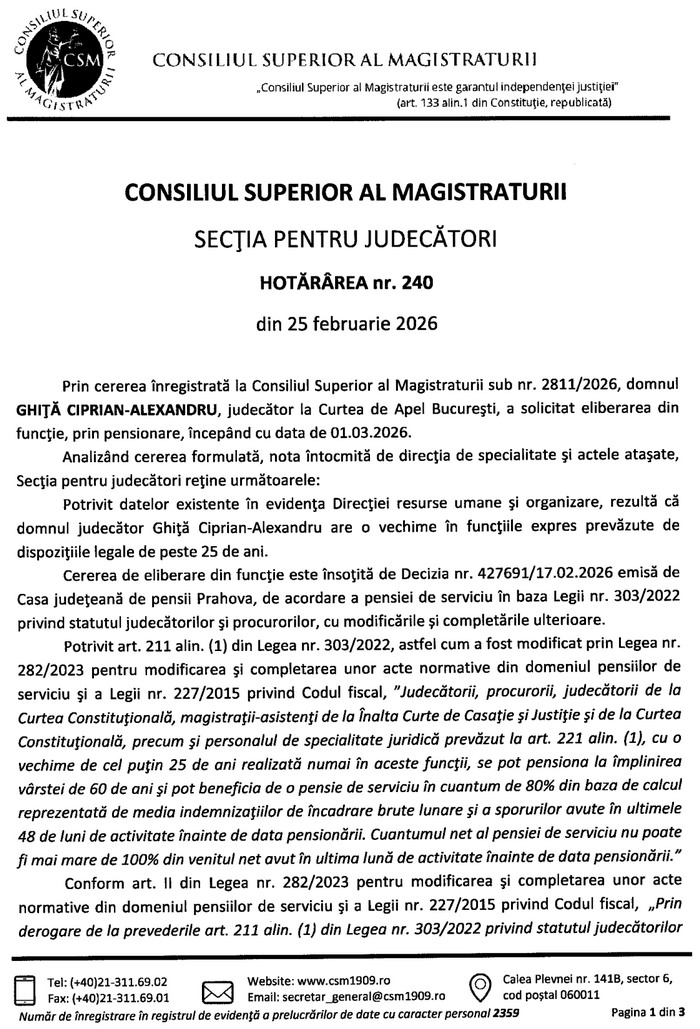 Așa cum reiese din Hotărârea Secției pentru judecători a CSM nr. 240 din 25 februarie 2026, la momentul întocmirii referatului de aprobare a pensionării, Ghiță îndeplinea condiția de vechime cerută de lege pentru ieșirea la pensie – mai exact, de 25 de ani, 1 lună şi 6 zile, având vârsta de 49 de ani, 1 lună și 14 zile.
