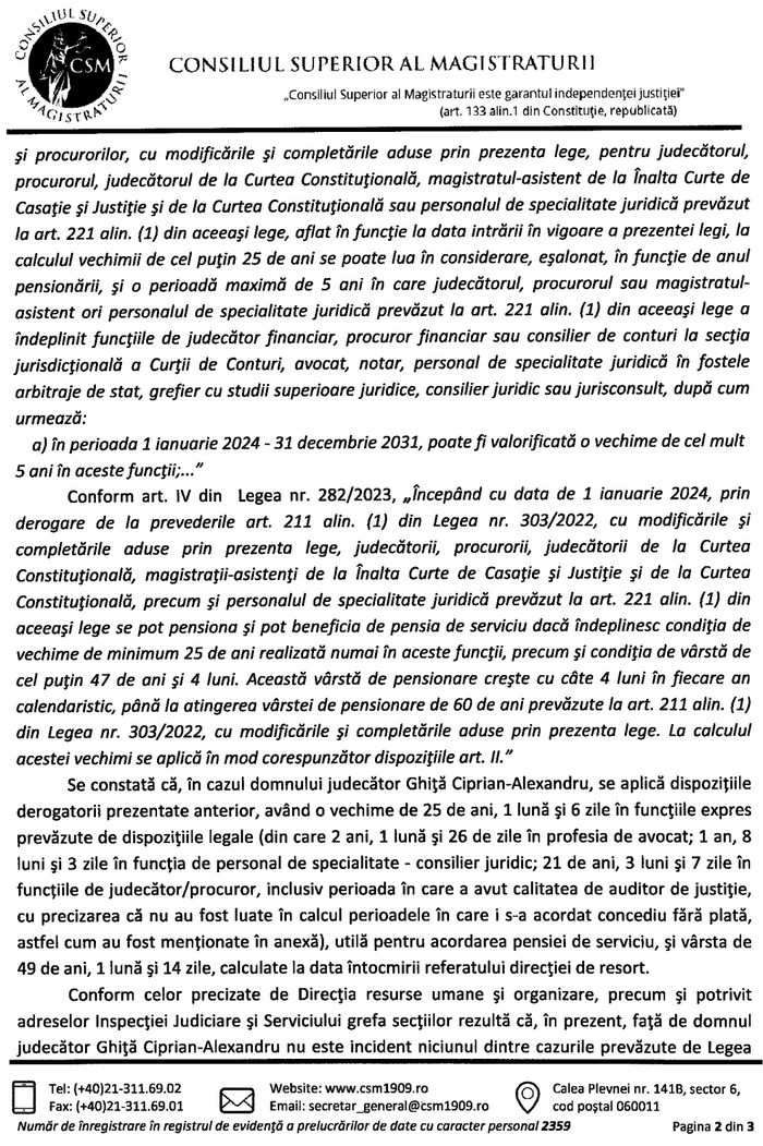 „Se constată că, în cazul domnului judecător Ghiţă Ciprian-Alexandru, se aplică dispoziţiile derogatorii prezentate anterior, având o vechime de 25 de ani, 1 lună şi 6 zile în funcţiile expres prevăzute de dispozițiile legale (din care 2 ani, 1 lună şi 26 de zile în profesia de avocat; 1 an, 8 luni şi 3 zile în funcţia de personal de specialitate - consilier juridic; 21 de ani, 3 luni şi 7 zile în funcţiile de judecător/procuror, inclusiv perioada în care a avut calitatea de auditor de justiţie, cu precizarea că nu au fost luate în calcul perioadele în care i s-a acordat concediu fără plată, astfel cum au fost menţionate în anexă), utilă pentru acordarea pensiei de serviciu, şi vârsta de 49 de ani, 1 lună şi 14 zile, calculate la data întocmirii referatului direcţiei de resort”.