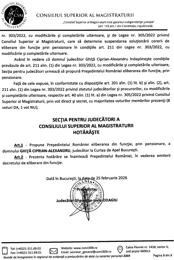 Secția pentru judecători a CSM a aprobat în 25 februarie 2026 cererea lui Ciprian Ghiță de eliberare din funcție prin pensionare. A existat însă un vot împotriva ieșirii la pensie a lui Ghiță.