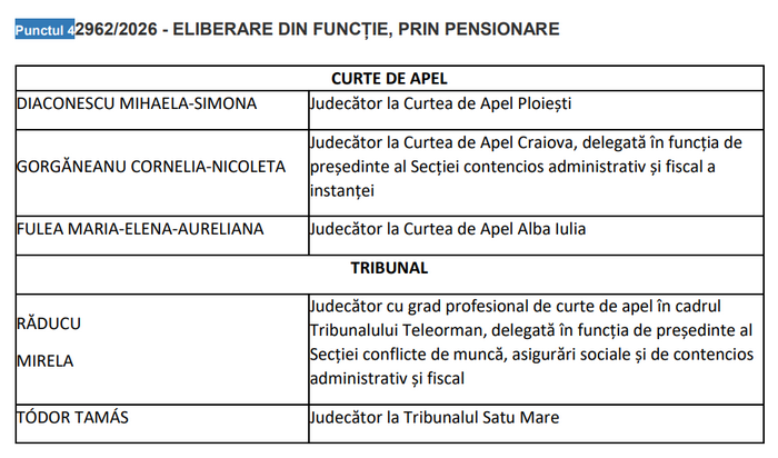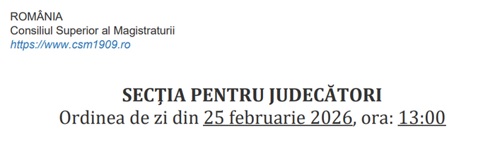 Cert este că până în momentul de față, conform ordinii de zi afișate pe site-ul CSM, judecătorii care așteaptă să fie eliberați din funcții în ședința Secției pentru judecători de miercuri, 25 februarie 2026, sunt: