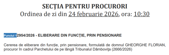 În ceea ce privește Secția pentru procurori a CSM, pe ordinea de zi a ședinței de marți, 24 februarie 2026, figurează o singură cerere de eliberare din funcție prin pensionare, cea a procurorului Florian Gheorghe de la Parchetul Tribunalului Dâmbovița.