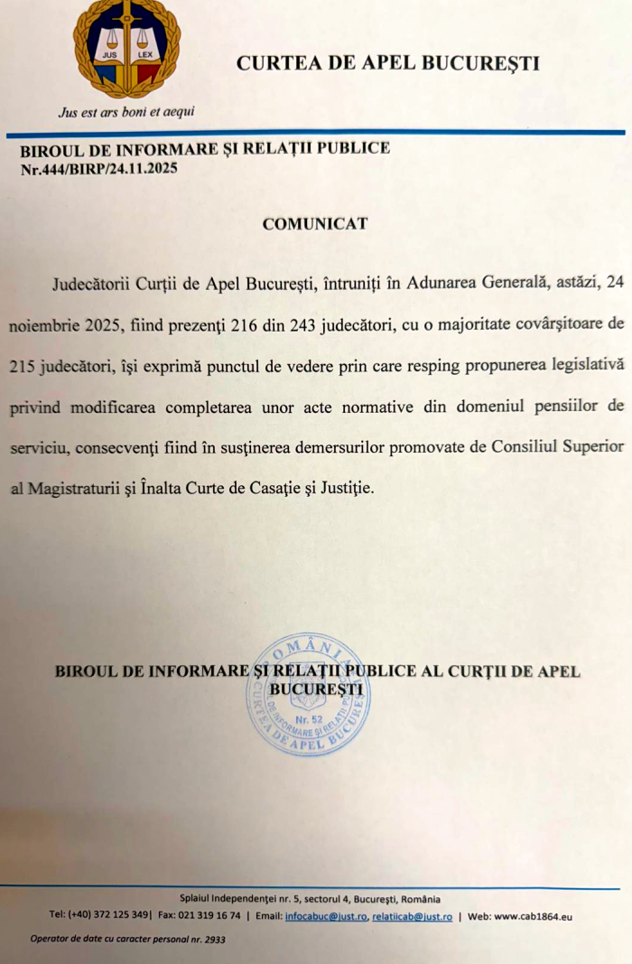 „Judecatorii Curtii de Apel Bucuresti, intruniti in Adunarea Generala, astazi, 24 noiembrie 2025, fiind prezenti 216 din 243 judecatori, cu o majoritate covarsitoare de 215 judecatori, isi exprima punctul de vedere prin care resping propunerea legislativa privind modificarea completarea unor acte normative din domeniul pensiilor de serviciu, consecventi fiind in sustinerea demersurilor promovate de Consiliul Superior al Magistraturii si Inalta Curte de Casatie si Justitie”.