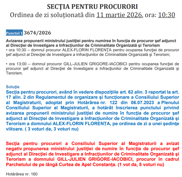 Secţia pentru procurori a Consiliului Superior al Magistraturii a avizat negativ propunerea ministrului justiţiei de numire în funcţia de procuror şef adjunct al Direcţiei de Investigare a Infracţiunilor de Criminalitate Organizată şi Terorism a domnului GILL-JULIEN GRIGORE-IACOBICI, procuror în cadrul Parchetului de pe lângă Curtea de Apel Constanța. (1 vot da, 5 voturi nu)”.