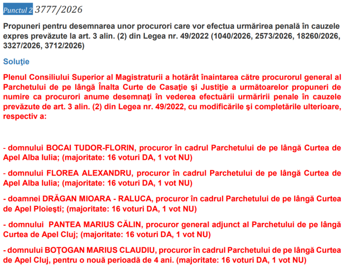 - domnului BOŢOGAN MARIUS CLAUDIU, procuror în cadrul Parchetului de pe lângă Curtea de Apel Cluj, pentru o nouă perioadă de 4 ani. (majoritate: 16 voturi DA, 1 vot NU)”.