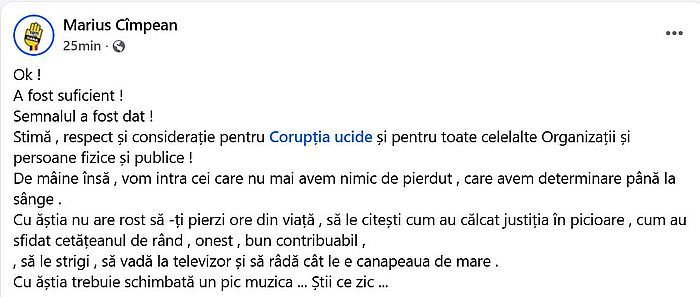 Un mesaj de o gravitate deosebita a fost transmis de un #rezist, vineri seara, 14 noiembrie 2025, dupa protestul esuat de la Inalta Curte (click aici pentru a citi). Este vorba despre un anume Marius Cimpean (foto), din Cluj, care, intr-o postare pe pagina sa publica de Facebook, postare prezentata de avocata Ingrid Mocanu, a explicat ca ”semnalul a fost dat”, dar ca “de maine insa, vom intra cei care nu mai avem nimic de pierdut, care avem determinare pana la sange”, caci “cu astia trebuie schimbata un pic muzica ... stii ce zic”.