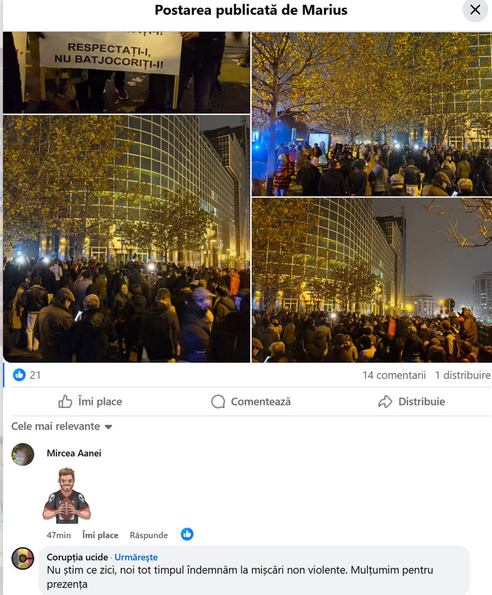 Mesajul este unul care, din punctul nostru de vedere, incita la violente impotriva magistratilor si o amenintare clara la adresa magistratilor. De altfel, postarea a fost considerata ca un indemn la violenta impotriva magistratilor chiar de ONG-ul “Coruptia ucide”, organizator al protestului de la ICCJ: “Nu stim ce zici, noi tot timpul indemnam la miscari non violente. Multumim pentru prezenta”.