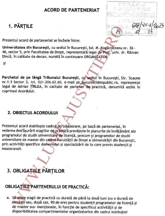 Parchetul de pe lângă Tribunalul București, (...), reprezentat legal de Adrian Ţîrlea (n.r. șeful PTB din 2024), în calitate de partener de practică, denumită astfel în cuprinsul Acordului.