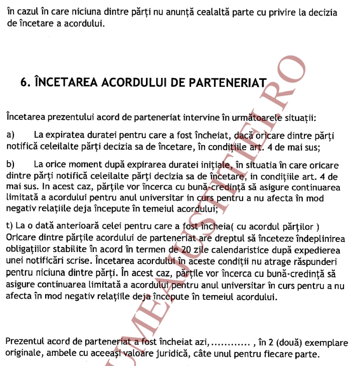 t) La o dată anterioară celei pentru care a fost încheia( cu acordul părţilor) Oricare dintre părțile acordului de parteneriat are dreptul să înceteze îndeplinirea obligaţiilor stabilite în acord în termen de 20 zile calendaristice după expedierea unei notificări scrise. Încetarea acordului în aceste condiții nu atrage răspunderi pentru niciuna dintre părți. În acest caz, părţile vor încerca cu bună-credinţă să asigure continuarea limitată a acordului pentru anul universitar în curs pentru a nu afecta în mod negativ relațiile deja începute în temeiul acordului.