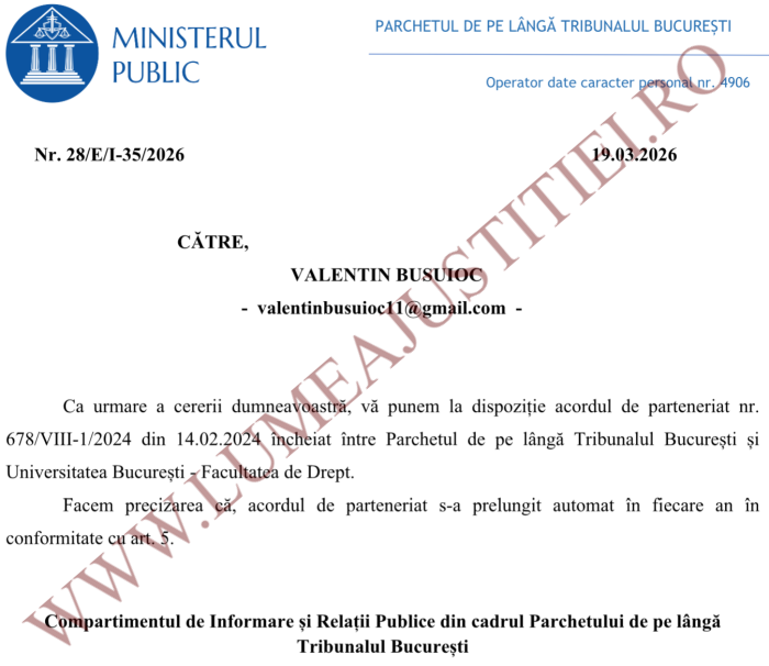 Iar acum Lumea Justiţiei prezintă acordul de parteneriat, pe care însuși Parchetul Tribunalului București ni l-a comunicat, ca răspuns la solicitarea trimisă în baza Legii nr. 544/2001 privind liberul acces la informațiile de interes public. PTB a precizat că acordul încă este în vigoare, prelungindu-se automat în fiecare an, în virtutea articolului 5.