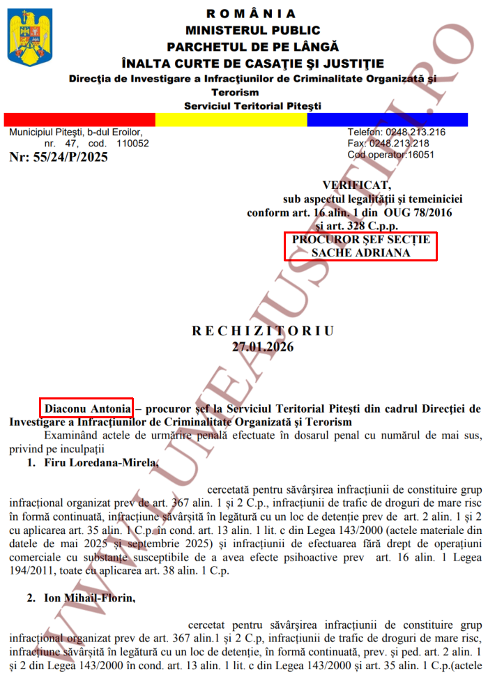 Magistratul Marius-Constantin Andronache de la Tribunalul Vâlcea a întors la DIICOT rechizitoriul nr. 55/24/P/2025, întocmit de către procuroarea Antonia Diaconu în dosarul-mamă din care a fost disjunsă cauza de mai sus, restituită marți la parchet de către judecătorul George-Nicolae Ionescu de la Tribunalul Vâlcea. După cum vedeți în facsimil, actul de acuzare din cauza de față a fost confirmat de către procuroarea Adriana Sache, șefa Secției de combatere a traficului de droguri din Structura Centrală a DIICOT.