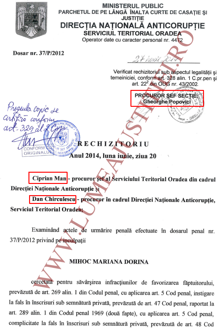 Ne referim la dosarul penal în care procurorii Ciprian Man și Dan Chirculescu (foto dreapta) au trimis în judecată lotul Galea-Vidican pentru așa-zise fapte de luare de mită constând în păstrăvi, whiskey un ceas cu cuc etc. Rechizitoriul nr. 37/P/2012 din 20 iunie 2014 – confirmat de către procurorul Gheorghe Popovici (foto stânga), șeful de la acea vreme al Secției I de la DNA Central (vezi facsimil) – s-a dovedit o catastrofă de proporții epice, picând în camera preliminară, apoi sfârșind prin clasare chiar la DNA. Totuși, acest aberant dosar a provocat suspendarea din funcție a judecătorilor Roman, Cuc, Galea și Vidican timp de un an și opt luni.