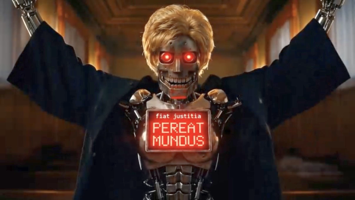 [Robotul:] 'Onorata curte, clientul meu este vinovat. Va solicit condamnarea lui la pedeapsa maxima si confiscarea totala a averii. Iar din datele pe care le detin, urmeaza sa-l condamnati si pentru alte 24 de posibile infractiuni, pe care, teoretic, ar putea sa le savarseasca in viitor'.