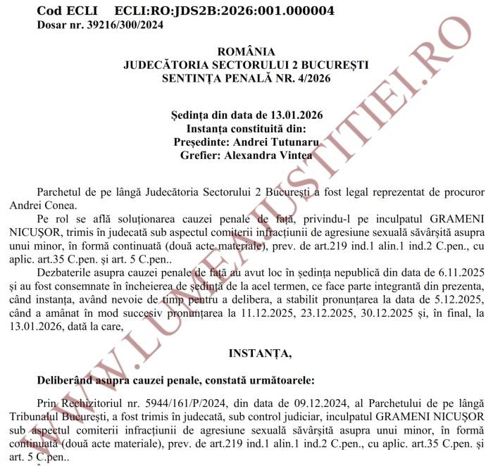 Între timp, marți, 13 ianuarie 2026, prin sentința nr. 4/2026, pronunțată în dosarul nr. 39216/300/2024, judecătorul Andrei Tutunaru de la Judecătoria Sectorului 2 l-a condamnat pe Nicușor Grameni la 6 ani de închisoare pentru agresiune sexuală asupra unui minor în formă continuată (două acte materiale) – vezi facsimil mai jos.