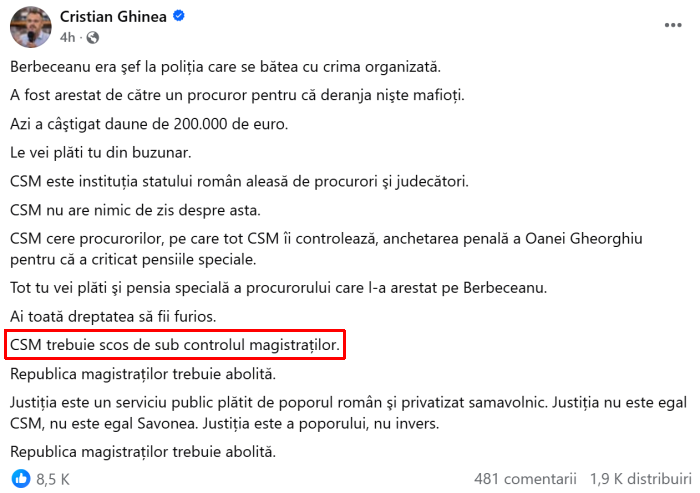 Ati inceput sa va trageti palme? Va credem. Iar lui Cristi Ghinea ii uram sa gaseasca pe cineva mai alfabetizat decat el, care sa ii citeasca articolul 133 din Constitutie. Adica exact pasajul care spune ca in componenta Consiliului Superior al Magistraturii intra – ce sa vezi? – magistrati. Nu politicieni, nu agitatori #rezist. Ca doar de-aia ii si zice numele ca este „al magistraturii”. E ca si cum ai propune sa depolitizam Parlamentul.