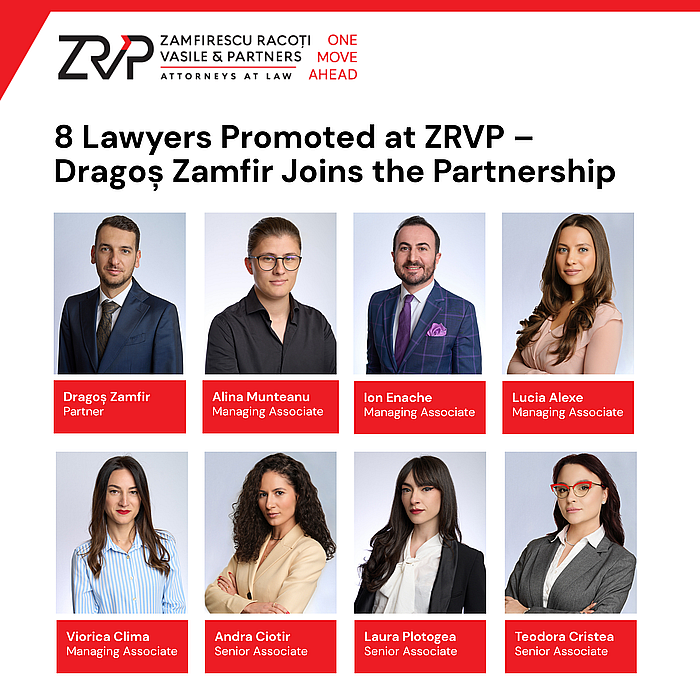Zamfirescu Racoți Vasile & Partners (ZRVP) anunță promovările realizate în cadrul echipei începând cu luna martie 2026. Dragoș Zamfir, avocat în cadrul departamentului Litigii, devine al 18-lea partener al firmei. Alina Munteanu, Lucia Alexe, Viorica Clima și Ion-Gabriel Enache sunt promovați ca Managing Associates, iar Teodora Cristea, Andra Ciotir și Laura Plotogea avansează la statutul de Senior Associate. Promovările reflectă evoluția profesională a unei noi generații de avocați formați în cadrul firmei și rolul central pe care îl are dezvoltarea internă a echipelor în strategia ZRVP.